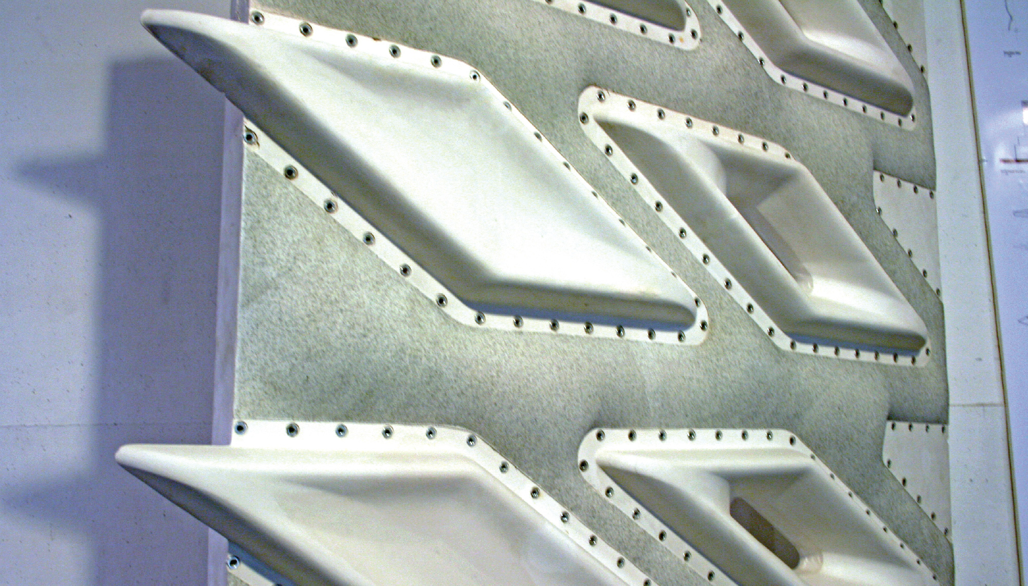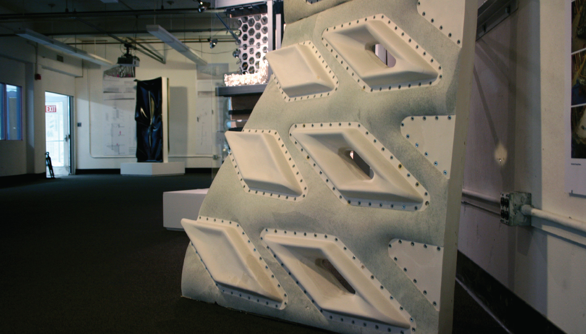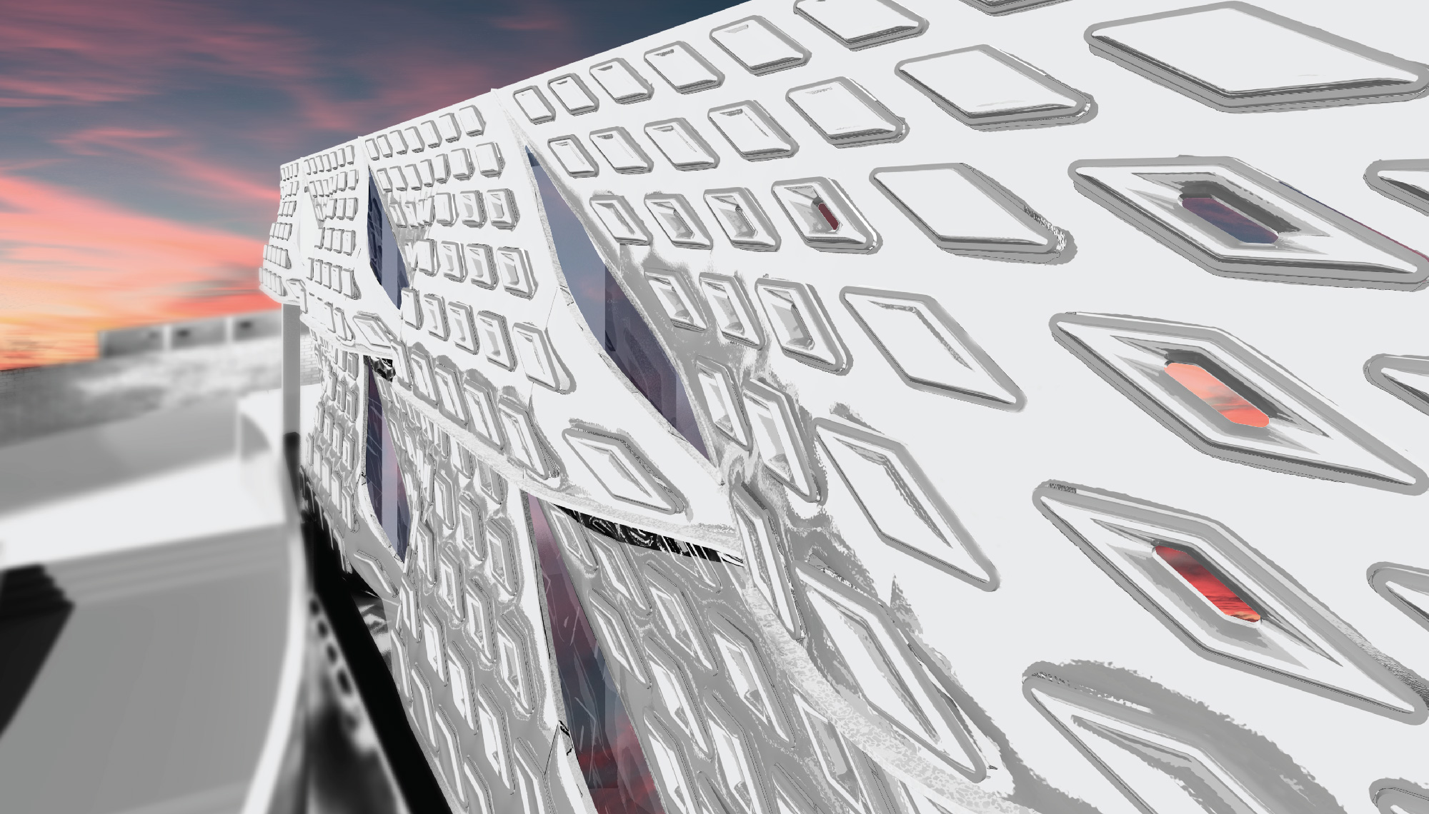 In addition to the variations of form, subtraction and slicing of panels create further variability. Within the machine, frames can adjust based on the diagonal grid of the tiles, slicing the panel on a diagonal. In conjuction with large scale geometry formed by the ribbed form, openings in the panels are made, offering opportunities for glazing.