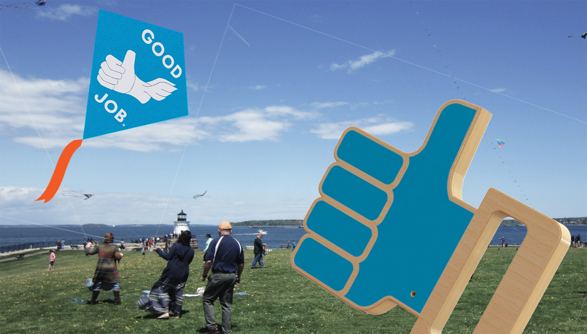 The kite handle is an opportunity to add value through visual comedy. Much like how a foam fi nger lets the user make a statement about who exactly is number one, the kite handle is an opportunity to spread positivity as if to say, “Hey dude, good job.” The thumbs up hand signal is the universal sign of positivity, and it’s integration into the kite handle makes a whimsical and comedic statement.